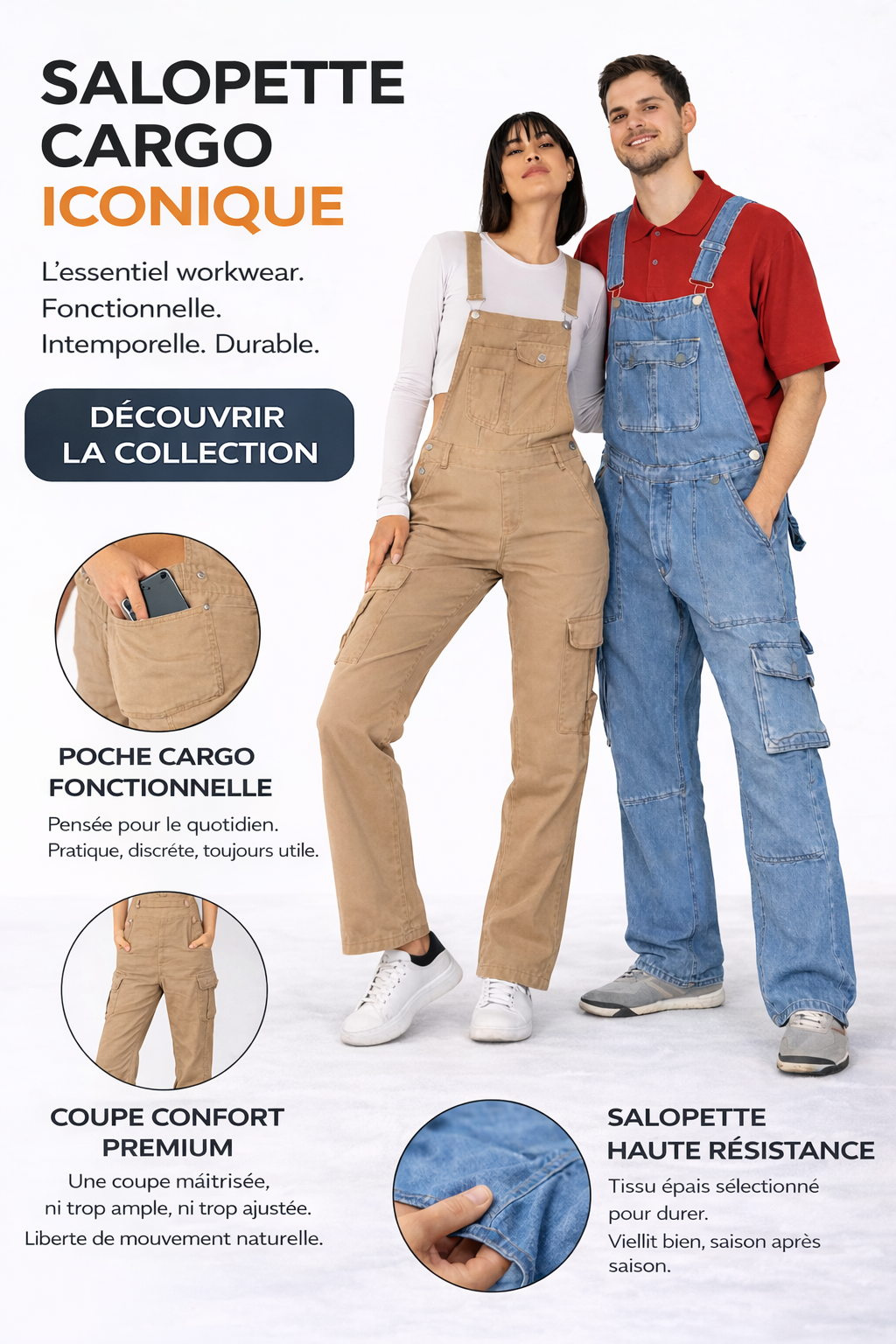 Découvrez notre collection de salopettes conçue pour allier style, confort et durabilité, adaptée à toutes les occasions. Que vous cherchiez une coupe décontractée pour le quotidien, une version plus structurée pour le travail ou un modèle tendance pour sortir, notre gamme propose des options pour hommes et femmes